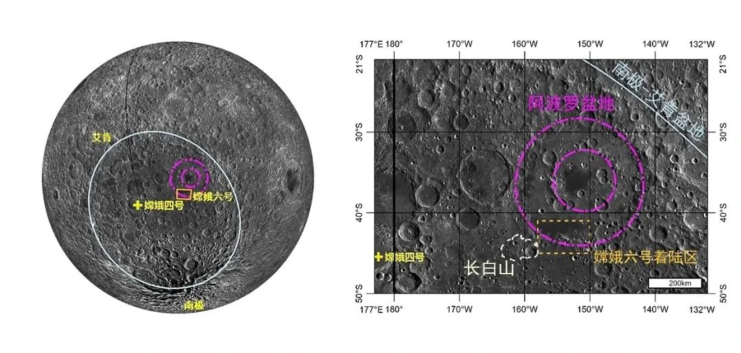 月球南极-艾肯盆地、阿波罗盆地、嫦娥六号着陆区、长白山位置关系图,可以见到南极-艾肯盆地并不显眼。图片来源:参考文献5