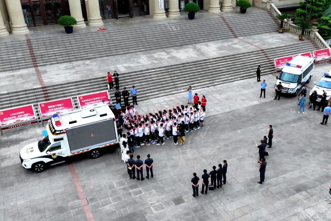 开州法院综合大楼前,三级法院领导、全国(市)人大代表和开州区关工委、开州区团区委、开州区妇女联合会、开州区教委的相关领导与小朋友们一起合影留念。