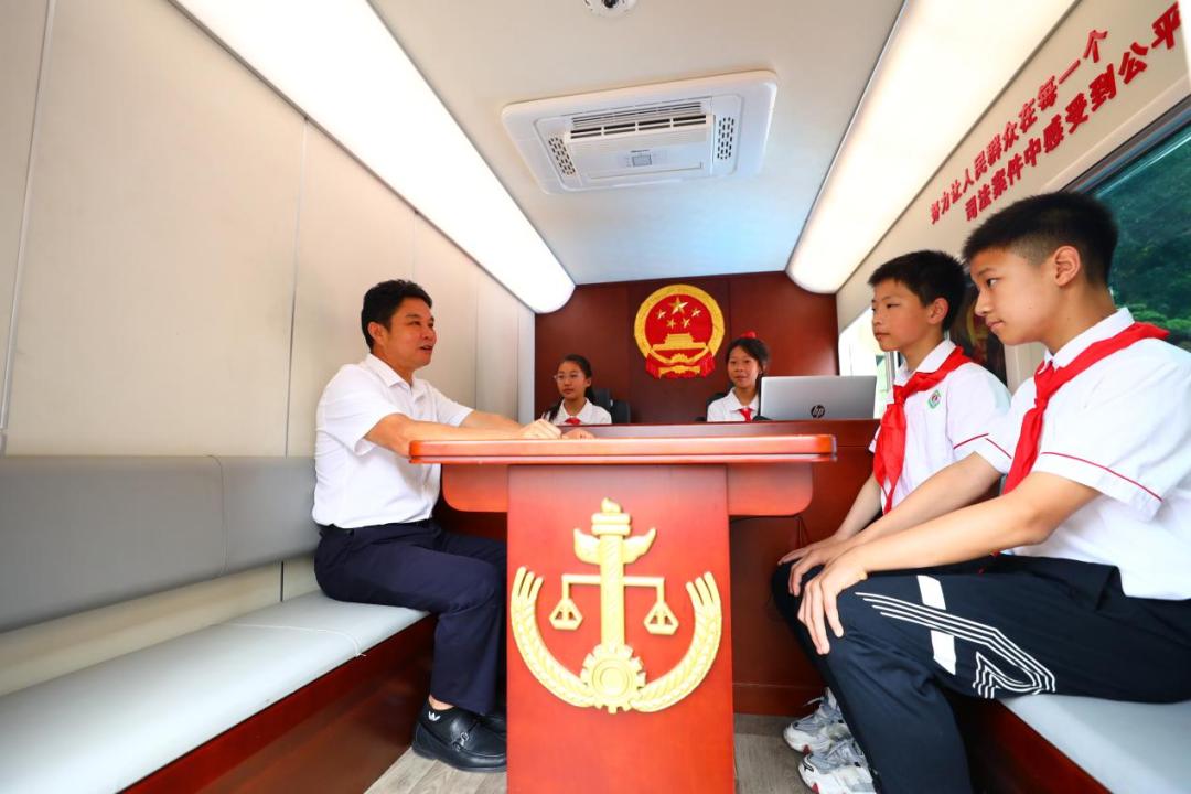 车载便民法庭播放着宣传视频,讲解员向小朋友们讲解车载便民法庭有什么作用、如何运用。小朋友们争先恐后的上车体验巡回审判,零距离接触车载便民法庭的各种设施,对车载便民法庭有了更加直观、深刻的认识。