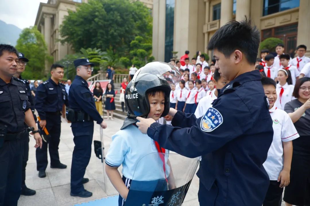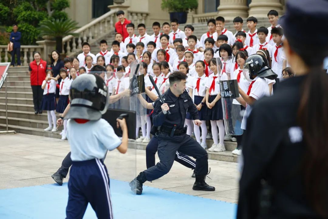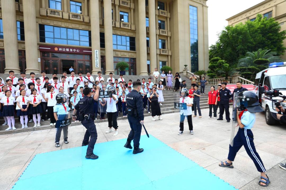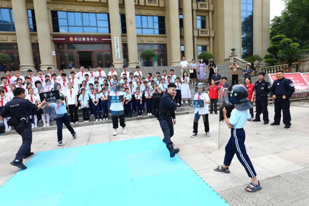 左右滑动查看更多英姿飒爽的青年法警们,耐心的向小朋友们介绍各类警械警具,进行应急事件、突发事件处置演练,表演擒拿格斗技巧,赢得小朋友们阵阵欢呼呐喊和热烈掌声。胆大的小朋友还主动上台,戴上头盔,举起盾牌,向法警叔叔们学习警械警具的使用。