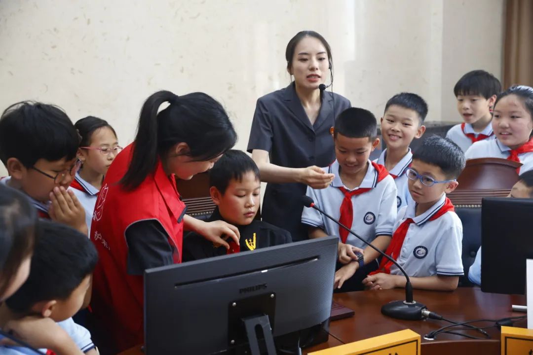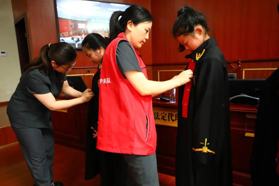 左右滑动查看更多进入到模拟法庭,汉丰三校的同学分别扮演主审法官、合议庭成员、公诉人、被告人、辩护人、法定代理人、值庭法警等角色,为参加公众开放日的小朋友们献上从庭前宣布法庭纪律、核对当事人身份信息、宣布审判组织、法庭调查、法庭辩论到庭审结束的一整场模拟庭审,整场表演细节到位、程序规范、精彩纷呈。模拟庭审后,重庆市第二中级人民法院未成年人案件审判庭的同志向小朋友们介绍了渝二中法院打造的“三峡小鱼儿”未成年人司法保护品牌,同时介绍了文创公仔“小渝法官”,“小渝法官”采用套装造型,整体呈拟人化,头部是胭脂鱼造型,身着法袍、手持《中华人民共和国未成年人保护法》,六种颜色寓意着对未成年人的“六大保护”,精美的设计赢得小朋友们阵阵赞叹。开州法院的法官还向小朋友们讲解了预防网络诈骗、反校园欺凌、远离毒品远离犯罪的相关知识,组织有奖问答,向参加活动的小朋友赠送了精心制作的印有“开心小渝儿”标识的手提袋、笔记本、笔袋等文创小礼品,小朋友们不时发出阵阵开心的笑声、欢呼声。