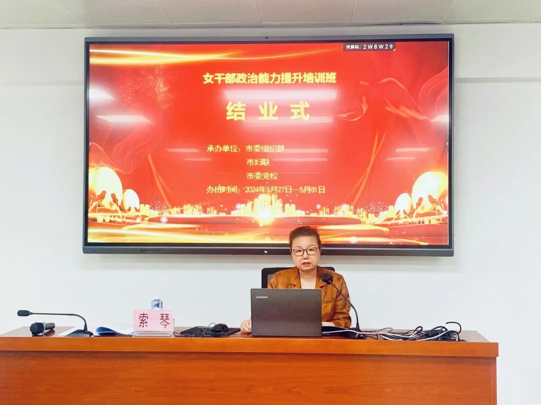 市妇联副主席索琴出席结业仪式并作总结讲话市妇联副主席索琴作培训总结讲话。她对市委组织部的精心指导、市委党校的大力支持以及党校老师的辛勤付出表示感谢。听了学员们的学习交流后,她认为,学员学习热情高涨、主动积极,善学善思,氛围浓厚,培训班达到了预期目的,取得了良好效果。她寄语大家要学以致用、身体力行,把学习成果落实到履职尽责、推动事业发展上,利用自身职业特点和优势为妇女儿童事业发展添砖加瓦,真正做一名时代需要、人民满意的好干部。