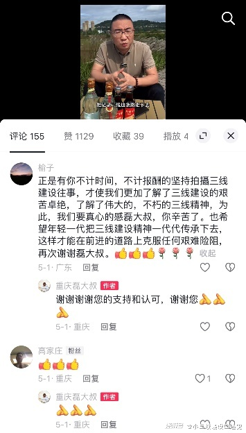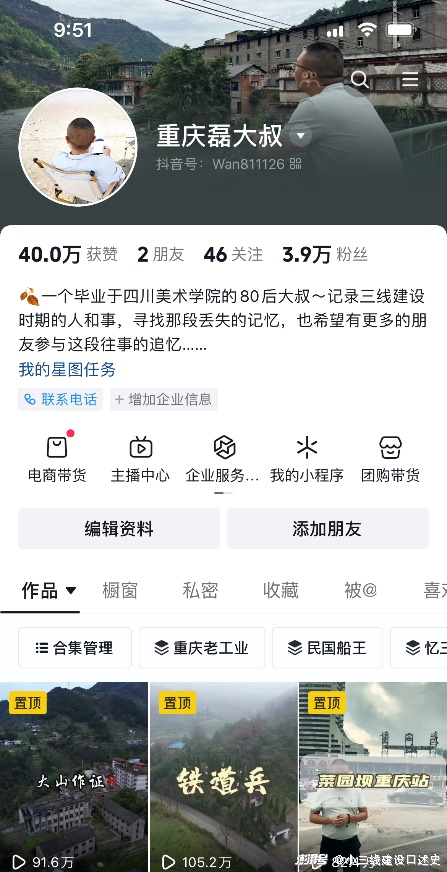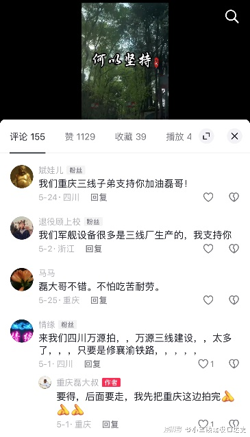 《重庆磊大叔》是抖音和微信视频号帐号。帐号的粉丝数量也从一开始的0到现在接近11万。我已经走访记录了重庆地区的三线建设的73个厂区,短视频已制作258个,整体视频播放量已经接近4000万播放量,平均每个视频的播放量达到15万。