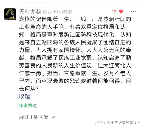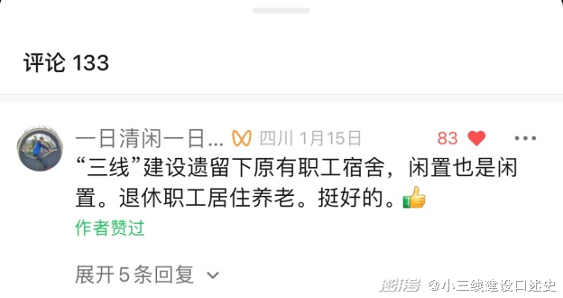 我现在所做的记录是他们曾今的贡献,我走访记录一个厂区也许只花一天或两天时间就能完成,但他们在那里一呆就是一辈子。在一个穷山沟沟里面,第一代建设者在那里艰苦创业建设了一座座军工厂,为祖国的国防建设作出了不可磨灭的贡献,和他们比起来我所做的事情真的是微不足道。