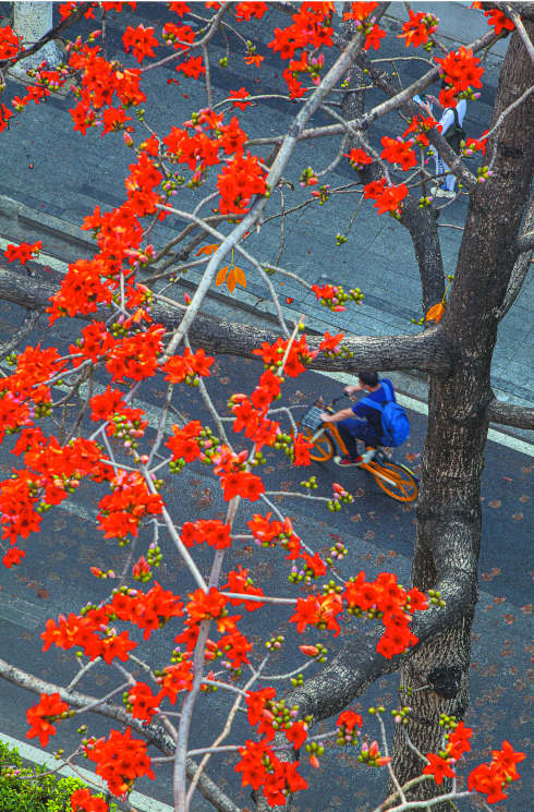 广州市民在木棉花下骑行。黄剑摄(人民视觉)