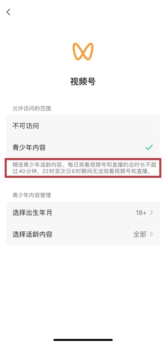 青少年内容分级青少年模式下,家长可设置视频号不可访问,或者允许访问青少年内容。额外设置“出生年月”、“适龄内容”后,可定向获取更适合的内容推荐。