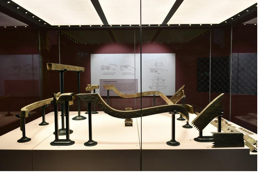 跟随着一件件珍贵的古文物逐步探索淮安的“前世”,偌大的展柜内,一件2004年在运河村战国墓出土的木雕鼓车吸引了众多游客的目光。据了解,这是国内考古发现中保存最完好和雕刻最精美的木雕鼓车,拥有着独一无二的精美纹饰。