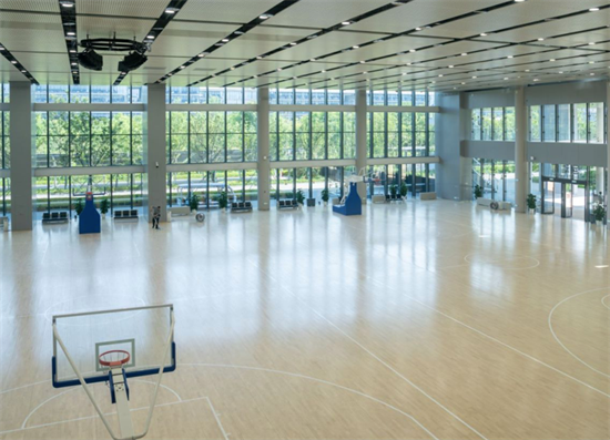 在新园区的东北侧,有一座通过了FIFA(国际足联)认证的标准足球场,以及400米跑道、篮球场、羽毛球场、健身房等设施,给人一种运动气氛十足的感觉。同时,每栋楼宇都设置了孕妇休息室、备奶室以及无障碍设施,为员工提供了舒适便利的工作环境。