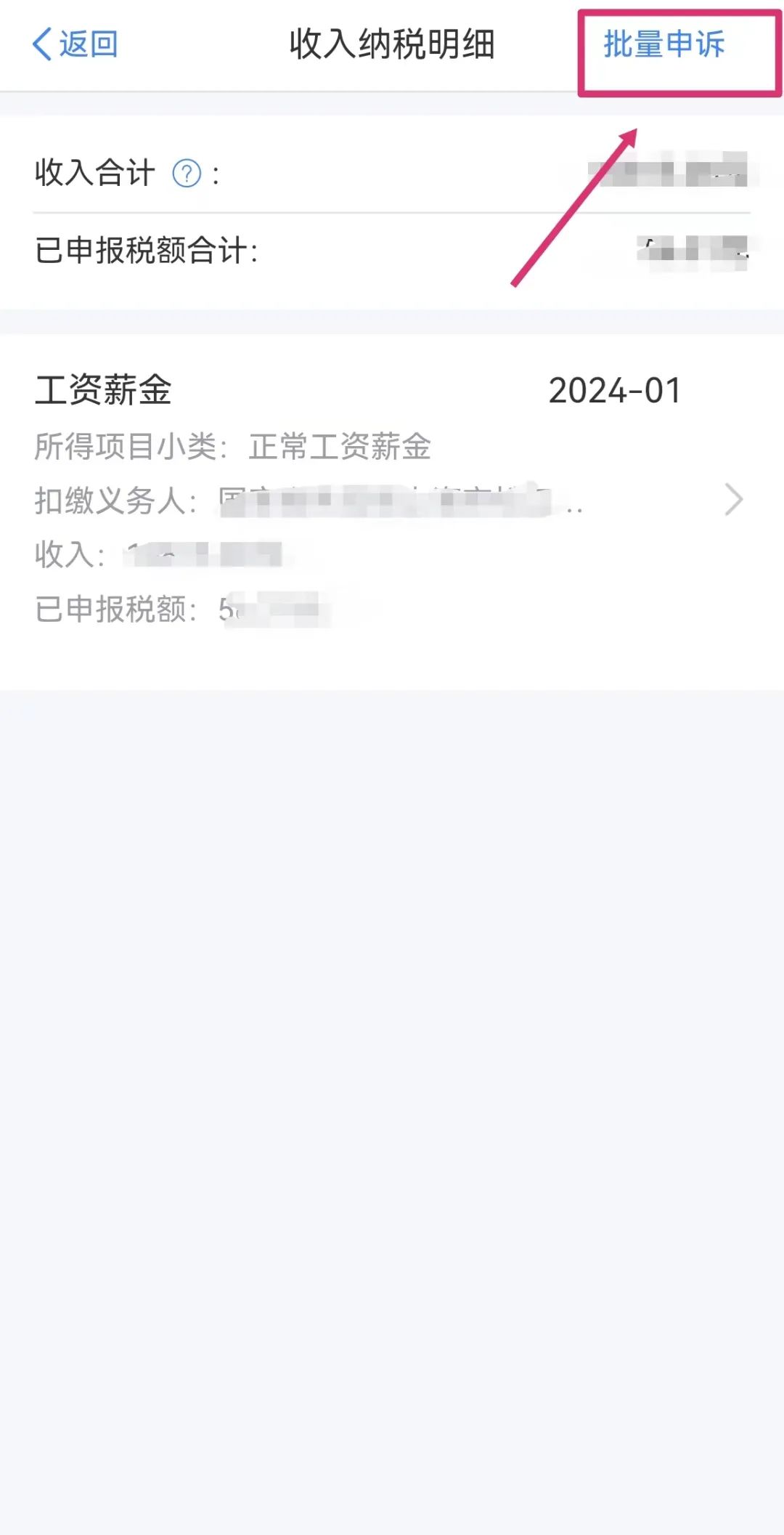 进入个人所得税APP,点击“服务”→“收入纳税明细查询”,选择“纳税记录年度”,点击“查询”,点开具体月份,然后对此月份的收入进行申诉,也可以对多个月份的收入进行批量申诉。
