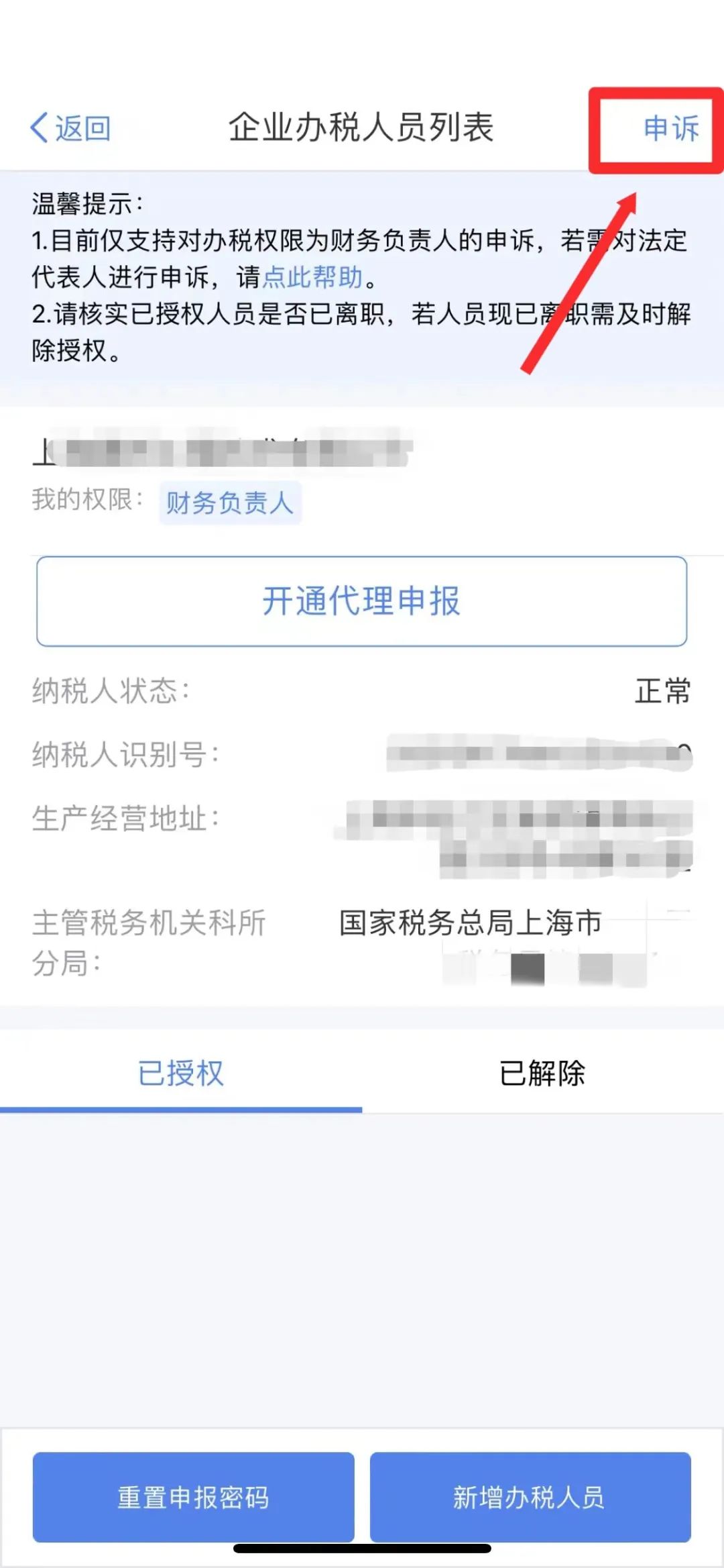 进入个人所得税APP,点击“我的”→“企业办税权限”,点开具体企业,对不属实的 “财务负责人”身份进行申诉。