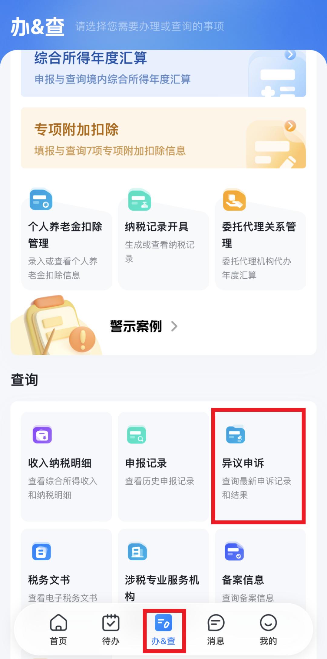 打开个人所得税APP,登录后从下方【办&查】栏进入,点击【查询】中【异议申诉】,进入【申诉记录】界面。