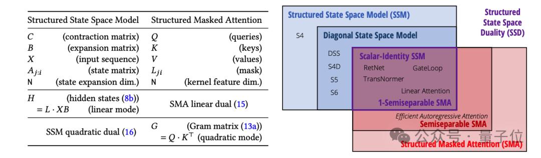 团队通过提出一个叫结构化状态空间二元性(Structured State Space Duality,SSD)的理论框架,把这两大模型家族统一了起来。