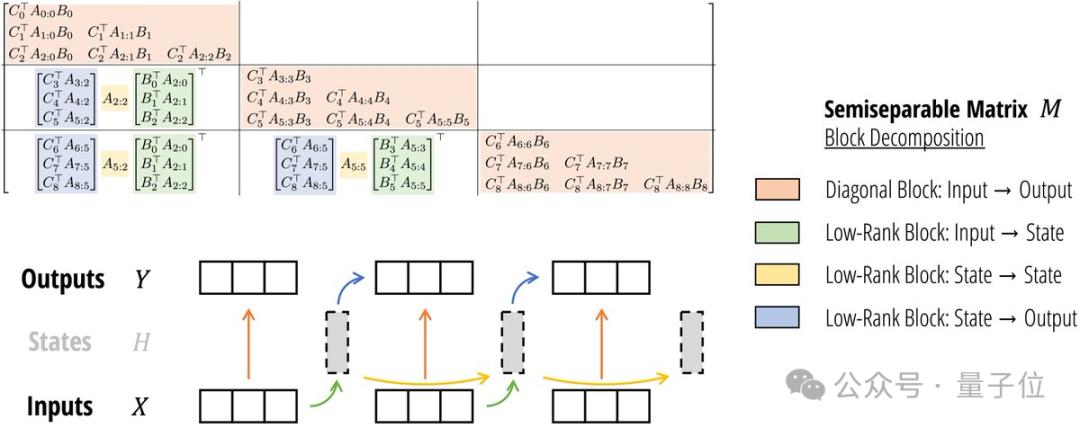 半可分离矩阵有着特殊的低秩结构,这种结构又恰好对应了SSM模型中的状态变量。