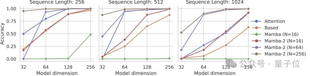 Mamba-2在需要更大状态容量的任务上比Mamba-1有了显著改进,例如硬关联召回任务 (MQAR)。