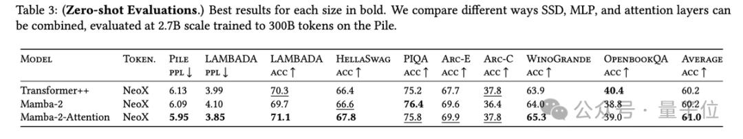 团队还对Mamba-2+注意力的混合架构模型做了一些实验。发现4-6个注意力层与Mamba-2层混合模型的性能,甚至优于Transformer++(原版结构+现代最佳实践)和纯Mamba-2。