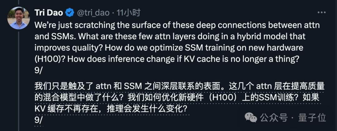 作者Tri Dao认为,这说明了Attention和SSM两种机制可以互为补充,另外他还提出了对未来研究方向的思考。