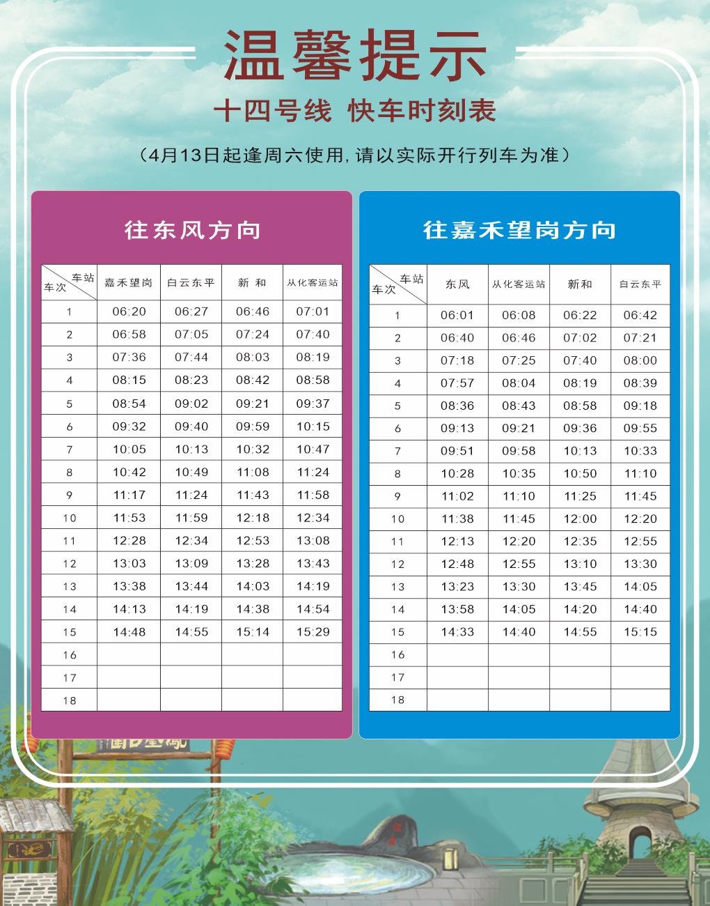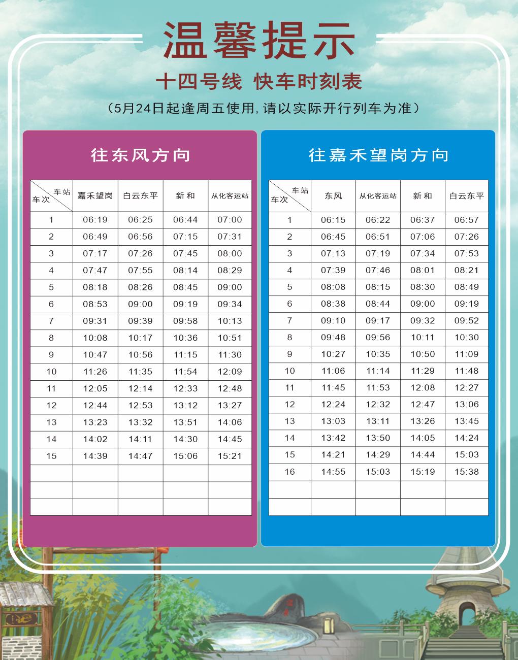 快车的实际到站时间会根据线路运营组织情况有所调整,时刻表仅供大家出行参考。请大家提前规划路径,留意车站广播及电视上的列车信息,预留足够的出行时间,尽量错峰出行。