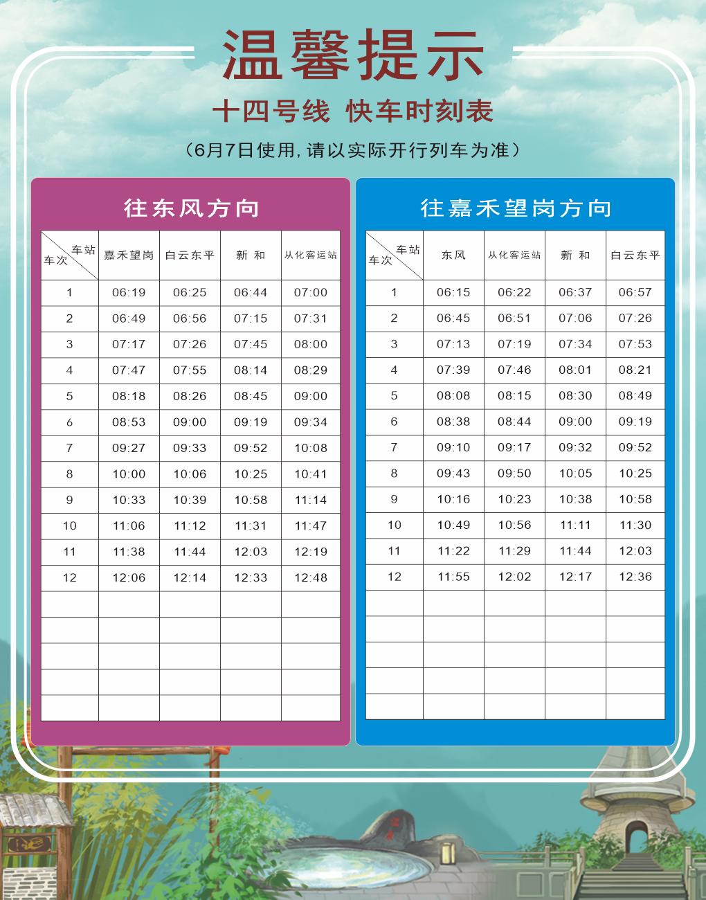 此外,6月7日12:10至运营结束、6月8日-10日13:00至运营结束,十四号线快车将改为普通车运行。6月10日13:30-21:00,十四号线开行“嘉禾望岗站至东风站”的大交路和“嘉禾望岗站至太平站”的小交路。