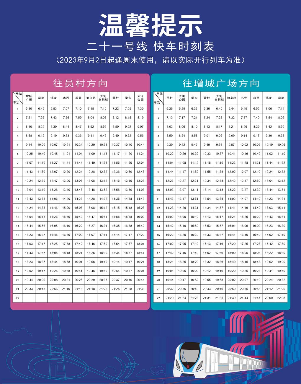 最新的快车时刻表大家也可在广州地铁官方微信订阅号二级菜单“运营资讯”里查询。