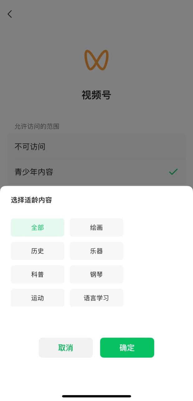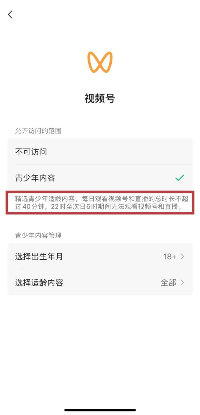 青少年内容分级青少年模式下,家长可设置视频号不可访问,或者允许访问青少年内容。额外设置“出生年月”“适龄内容”后,可定向获取更适合的内容推荐。