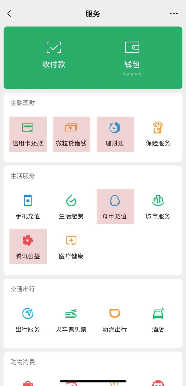 微信支付会隐藏Q币充值、理财通、信用卡的入口。看一看、附近的人、微信豆以及所有的小游戏均为默认不可访问状态,且无法进行设置修改。