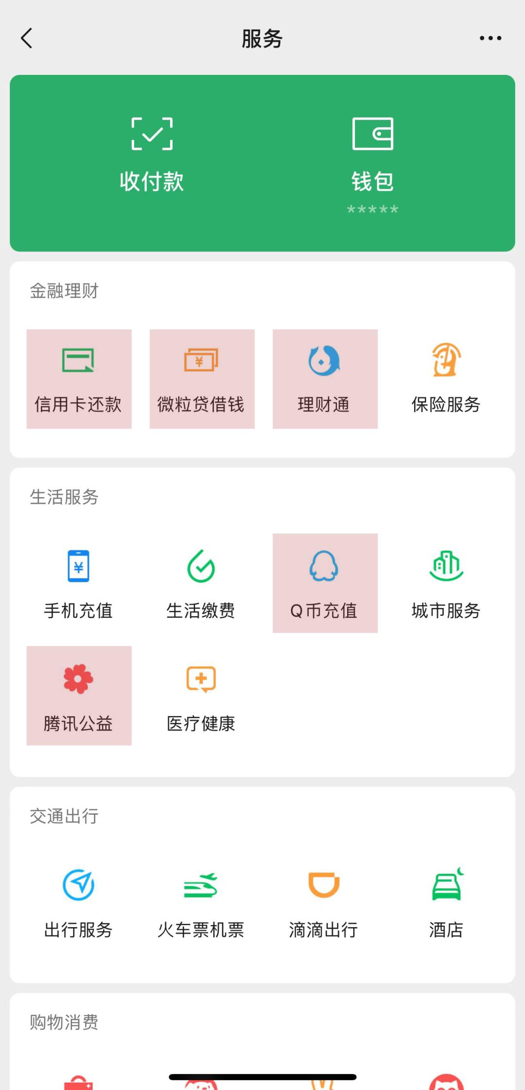 微信支付会隐藏Q币充值、微粒贷、理财通、信用卡的入口。看一看、附近的人、微信豆,以及所有的小游戏,均为默认不可访问状态,且无法进行设置修改。