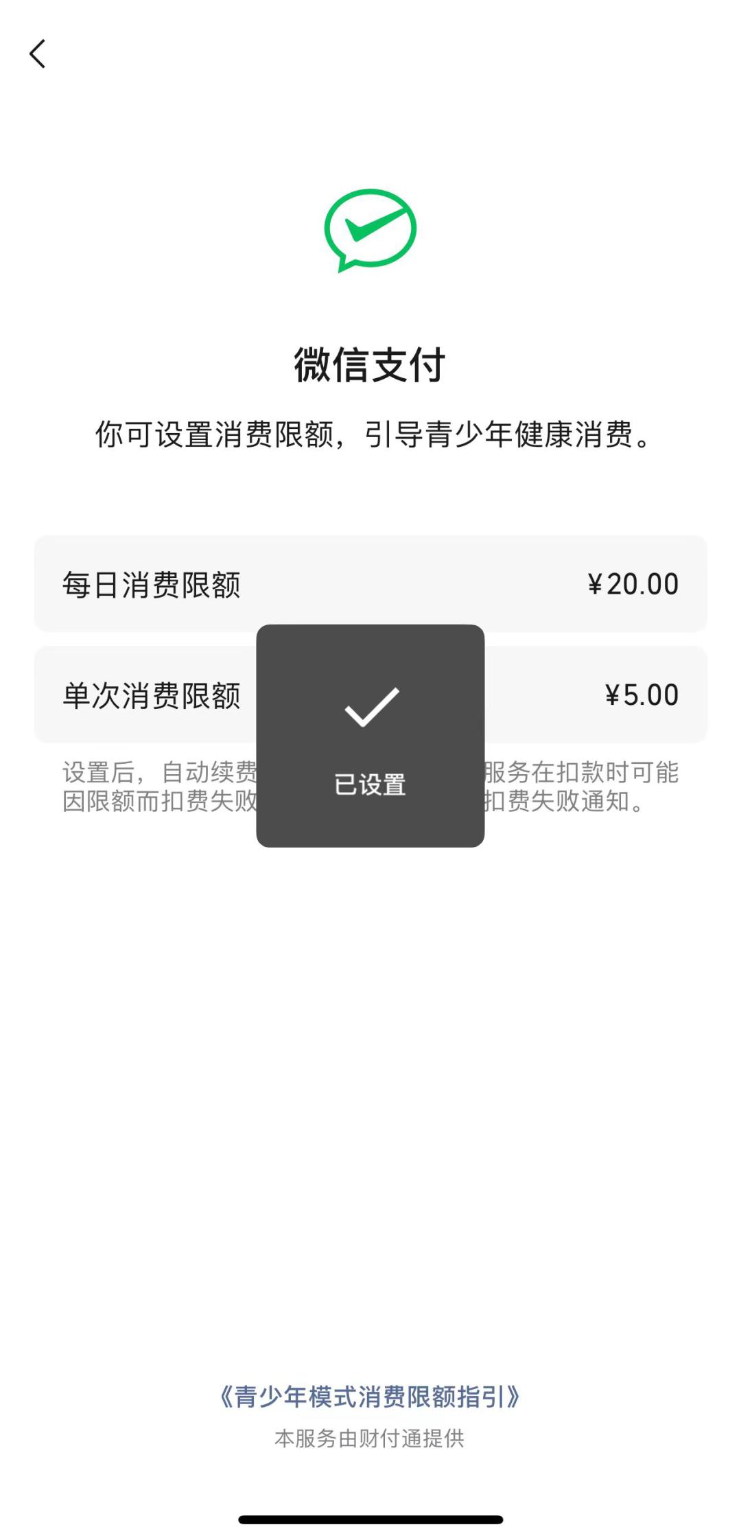 父母或监护人可以在青少年模式中设置微信支付的限额,包括“每日消费限额”和“单次消费限额”。完成设置后,青少年使用微信支付时,将会受到已设置的额度限制。
