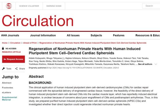 [1] Hideki Kobayashi et al, Regeneration of Nonhuman Primate Hearts With Human Induced Pluripotent Stem Cell–Derived Cardiac Spheroids, Circulation (2024). DOI: 10.1161/CIRCULATIONAHA.123.064876.https://www.ahajournals.org/doi/10.1161/CIRCULATIONAHA.123.064876