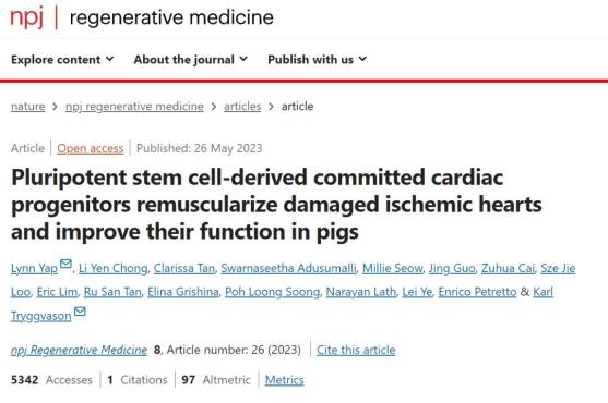 [2] Pluripotent stem cell-derived committed cardiac progenitors remuscularize damaged ischemic hearts and improve their function in pigs.https://www.nature.com/articles/s41536-023-00302-6.