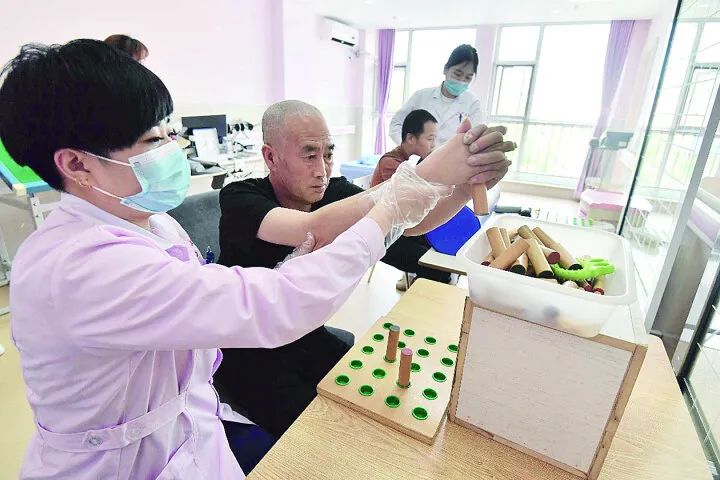 在OT训练室里,护士刘媛媛正带领老人做上肢训练——抓木钉。老人患脑血栓,抓木钉可以锻炼手的精准度。治疗师郭静带领老人正做滚桶练习,这也是老年病的康复性治疗。