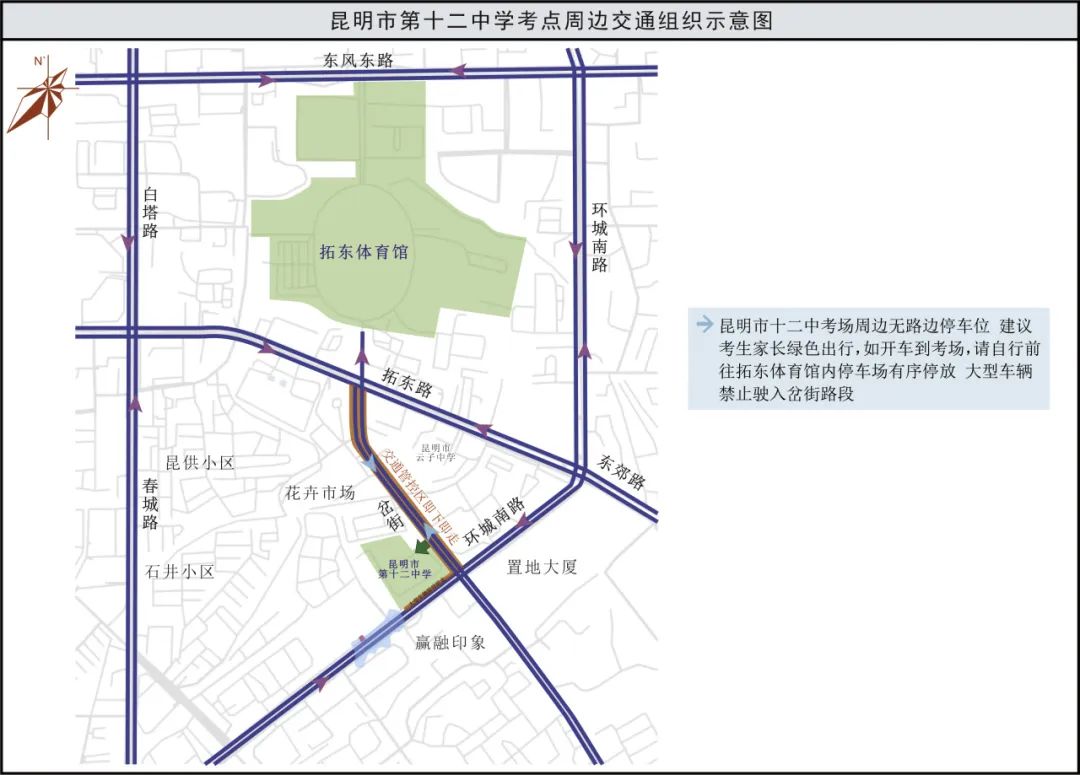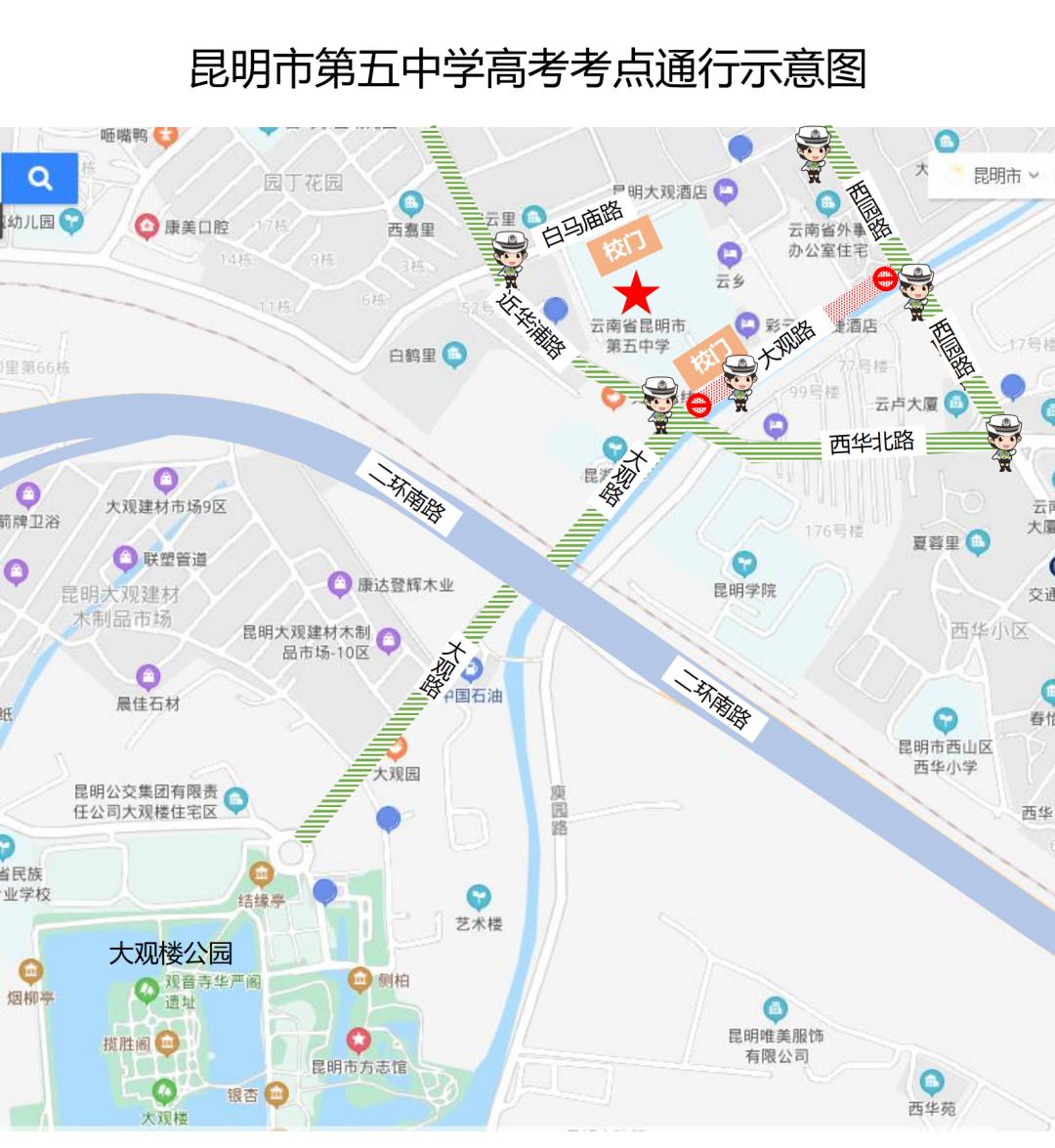 送考车辆到达考点周边路段,请听从现场交警指挥即停即走,昆华路(西昌路—环城西路)实行临时性交通管制,社会车辆可从西昌路、人民西路、环城西路绕行。