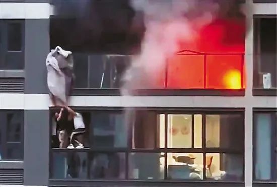 救援现场,关丽风等人在楼下撑起被子救人。图片截自网友现场视频被困者下坠的瞬间