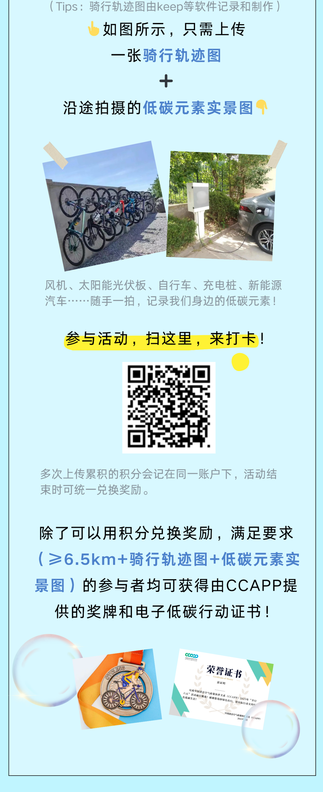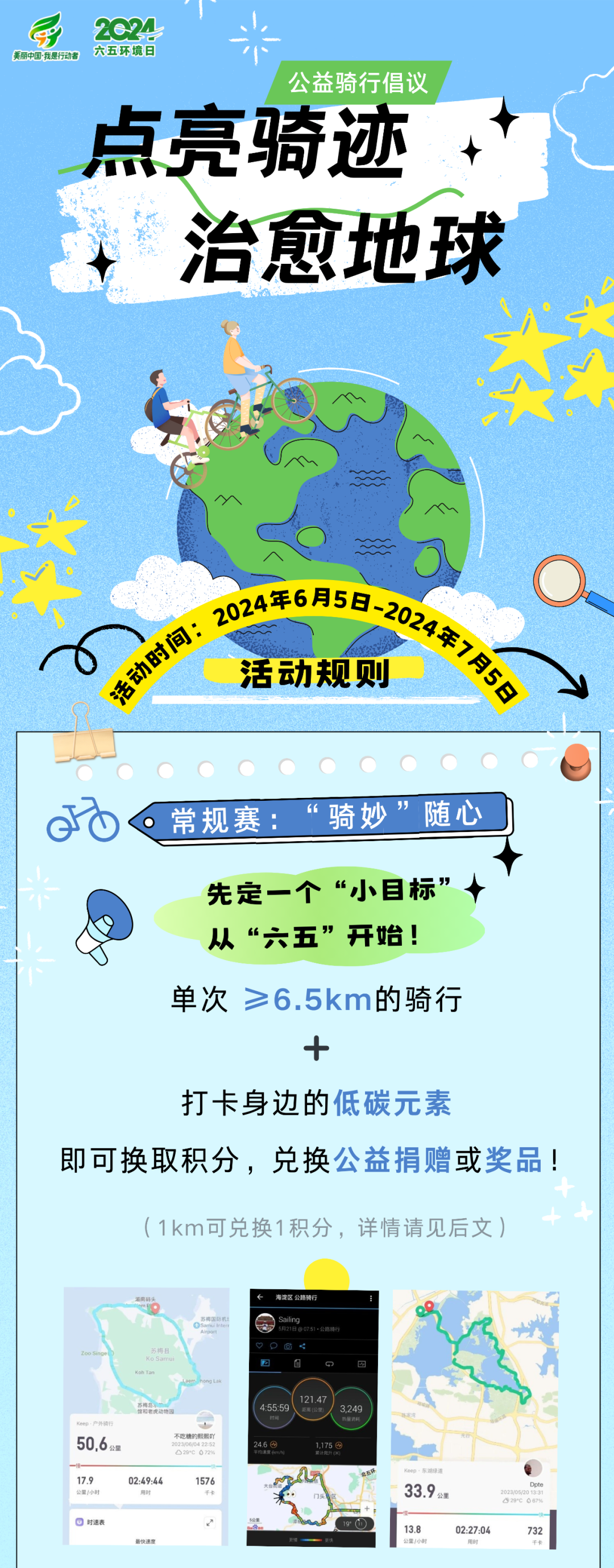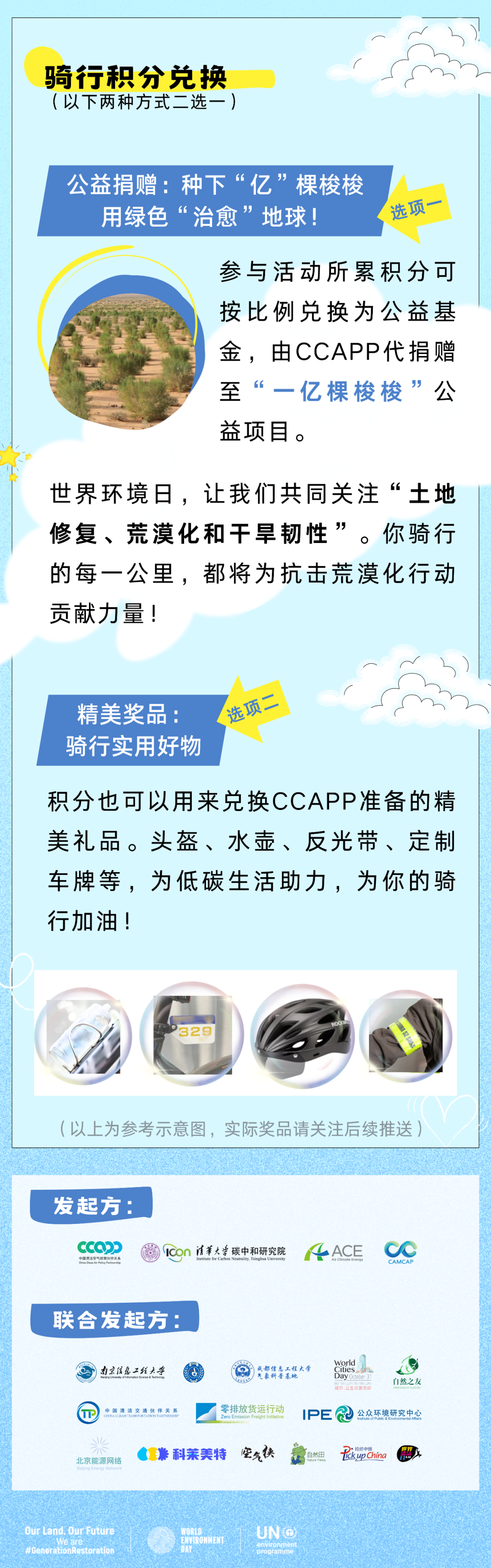 6月5日 是世界环境日。今年,在UNEP提出的“土地修复、荒漠化和干旱韧性”和我国提出的“全面推进美丽中国建设”两大主题下,CCAPP与清华大学碳中和研究院、能源基金会、城市大气综合管理与低碳行动伙伴(CAMCAP)携手南京信息工程大学、南京信息工程大学大气污染REACH研究组、成都信息工程大学气象科普基地、世界城市日、自然之友、中国清洁交通伙伴关系(CCTP)、零排放货运行动、公众环境研究中心(IPE)、北京能源网络(BEN)、科莱美特、空气侠、自然田、捡拾中国等机构,CCAPP志愿者社群,以及生态环境部宣教中心首席专家贾峰、生态环境部环规院首席专家薛文博等资深骑行践行者,联合发起“点亮骑迹,治愈地球”六五公益骑行倡议。骑行里程将有机会助力沙漠化防治公益项目。