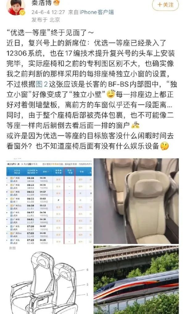 铁路摄影博主@秦浩博表示,优选一等座已经录入了12306系统,也在17编技术提升复兴号的头车上安装完毕,实际座椅和之前的专利图区别不大,采用每排座椅独立小窗的设置。
