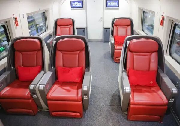 商务座座椅。图源:昆明铁路一等座:一等座通常采用2+2方式分布,空间相对二等座更大,A、F靠窗,C、D靠过道。