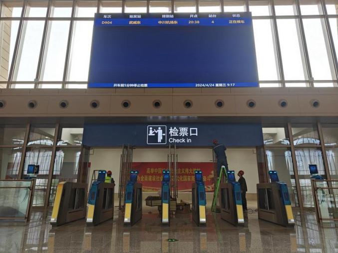 (兰张高铁兰武段检票口)武威东站是兰张三四线铁路中间站,是甘肃河西地区重要的铁路客运枢纽之一,该站为线侧下式站房,总建筑面积为11999平方米,建筑高度21.5米,主体为混凝土框架结构,屋顶采用钢桁架结构,车站站房主体两层,中间候车厅为通高一层,两侧为二层,地下局部一层,最高聚集人数1500人,站台设3台7线。铁路建成通车后,将进一步完善甘肃省西部地区高速铁路网布局、带动沿线区域经济发展。
