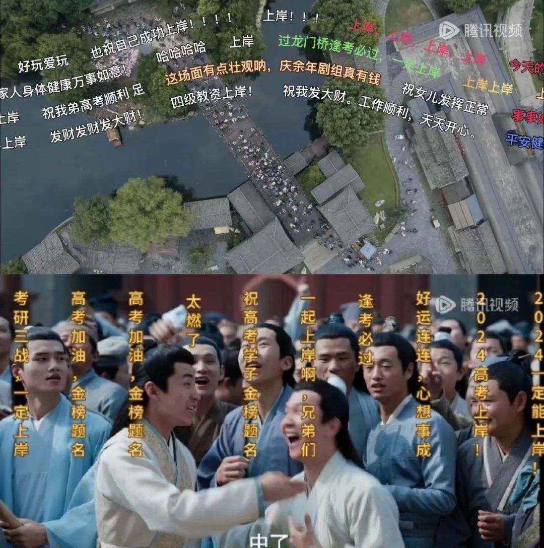 在剧播期间,腾讯视频运营玩法持续升级,为用户提供更好的观剧体验。在“春闱大考”剧情节点推出跃龙门弹幕和金榜题名弹幕效果,击中观众“上岸许愿“的集体情绪,更有庆学家专属追剧勋章、庆学家”宗师粉“认证考试、庆国父子情深榜、角色搭子PK大赛等趣味玩法,都增加了用户的讨论方向和深度参与感。