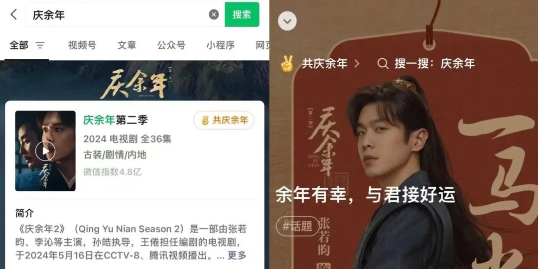 此次,腾讯视频充分调动生态优势,多端打通。如首次将内容连接到了覆盖11亿用户的微信搜索生态——在微信搜索《庆余年》,可以在腾讯视频小程序内追剧,并进行讨论,更能读原著、听原曲,一站式尽享“庆余年”全态内容。同时,平台联动了腾讯新闻、QQ、QQ音乐、阅文集团旗下起点读书等进行互动与合作,以腾讯生态的融合,让庆学之风吹遍全域。