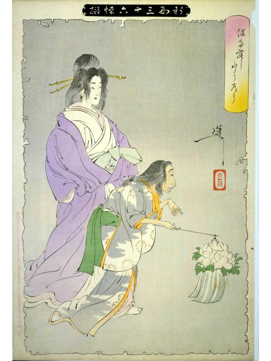 传说是死去产妇的怨念所化,常在黑夜中抱着婴儿行走,怀里婴儿的哭声化成了姑获鸟的叫声。