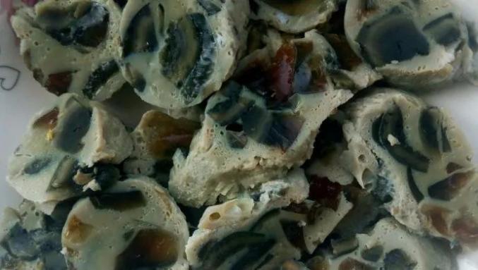 北方常见的松花蛋肠,用鸡蛋液和松花蛋混合灌肠,再蒸熟,就是一根碧绿又软嫩的松花蛋肠了。吃的时候切厚片,软嫩细腻风味独特。不过颜色略有些诡异,若是让不知情的外国人看了,大概又要大呼小叫了。