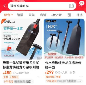 杉木传统龙(叠滘龙船)。摄/邱志钊至于价值40万的碳纤维龙舟桨,有点过于离谱了,在购物网站上可以轻松查到,一支桨,三位数就能拿下。