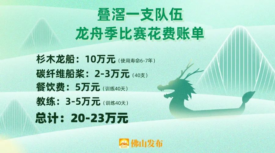 参加龙舟赛所需的费用,发布君请到南海桂城叠北东胜东队资深队员孔德志帮我们算算:以叠滘龙船赛为例,每赛季训练两个月左右,按照40天的赛训时间来算,龙船、船桨、餐饮、教练等各方面费用总计需要20-23万元。一条龙船的使用寿命为6-7年,除去新造龙船所需的10万元,每年龙舟赛所需资金约为13万元,与传闻中的200万相差甚远。