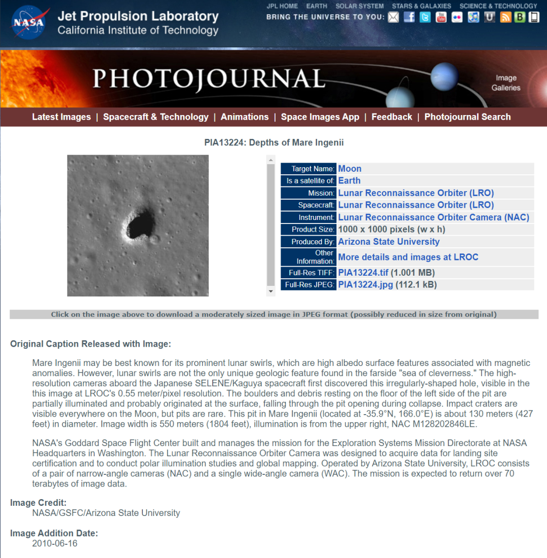 网传图片由亚利桑那州立大学使用月球勘测轨道飞行器相机(LROC)捕获。图片展示了位于月球背面智海(Mare Ingenii)上一个直径约为130米的凹坑,此凹坑最早由日本SELENE/Kaguya航天器上的高分辨率照相机发现。图片中,凹坑左侧地面上的巨石和碎屑被部分照亮,科学家们推断,它们可能是在凹坑坍塌过程中从开口处掉落的来自月表的物质。