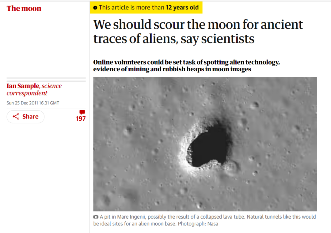 NASA指出,在月球上,撞击坑随处可见,但凹坑却很少见。2011年12月,《卫报》曾报道称,科学家们怀疑,月球上可能存在外星人路过月球时留下的信息、科学仪器、垃圾堆或采矿的证据,诸如月球上的凹坑,可能成为外星人月球基地的理想地点。为此,他们建议重新检查由仪器拍摄的数十万张月球照片。