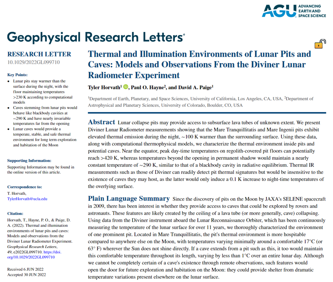2022年,NASA资助的科学家霍瓦斯 (Tyler Horvath)等人利用月球勘测轨道飞行器(LRO)航天器和计算机建模的数据,发现了在月球上名为“宁静海”的区域中,一个约100 米深的圆柱形凹陷处的阴影处的温度能始终保持在人体感受较为舒适的63华氏度(约17摄氏度)。霍瓦斯等人在《地球物理研究通讯》上发表的文章写道:“对于长期的月球探索来说,坑洞可能会提供一个理想的栖息地:它们在很大程度上不受有害辐射、撞击和极端温度的持续威胁。”
