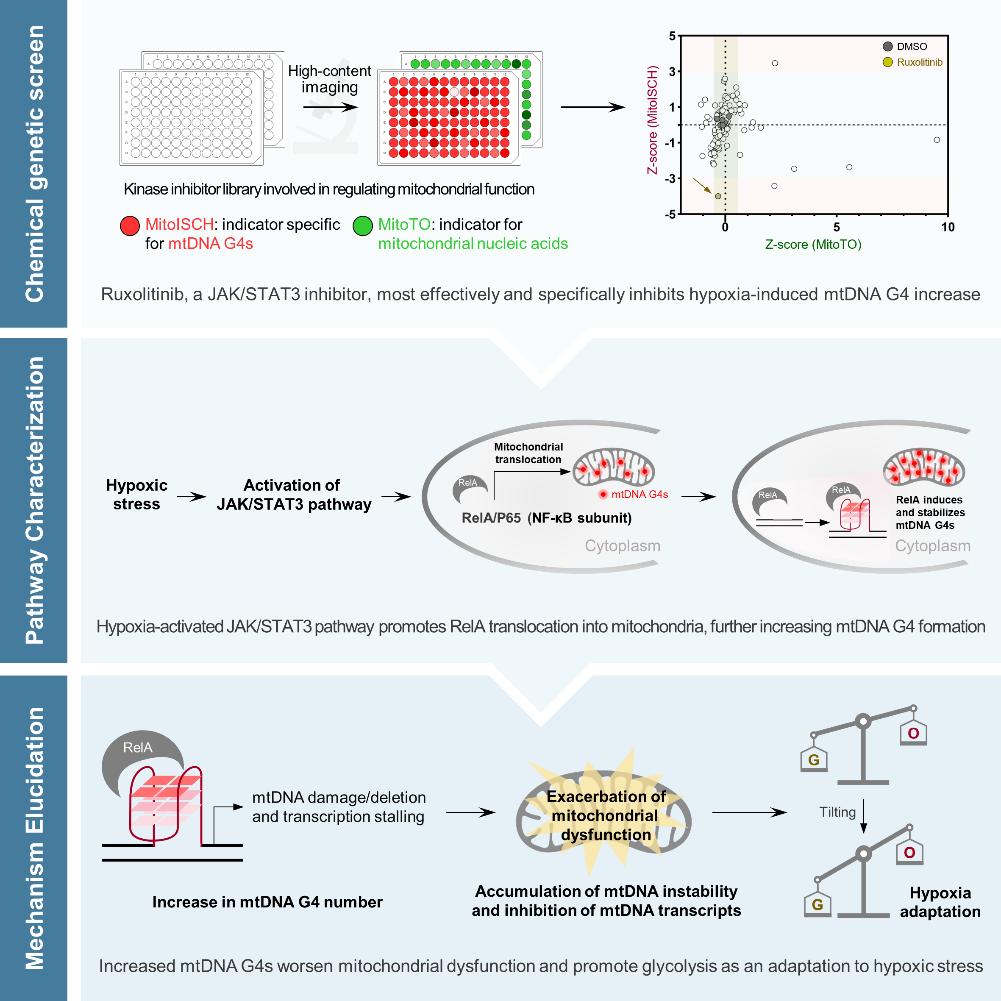 在前期研究中该团队也发现mtDNA G4数量在缺氧的癌细胞中会进一步增多,mtDNA G4可能是介导缺氧条件下癌细胞糖酵解水平增强的潜在因素。为了阐明这个调控过程的分子机制,进一步揭示mtDNA G4的生物学功能,研究者基于化学遗传学研究理念,利用mtDNA G4特异性荧光探针MitoISCH在乳腺癌细胞MCF-7上构建了相应的高内涵筛选模型。通过对影响线粒体功能的激酶抑制剂库进行筛选,在上游成功锁定JAK/STAT3是缺氧乳腺癌细胞中调节mtDNA G4形成最显著的通路。蛋白组学及相关作用机制研究表明,癌细胞缺氧所导致的JAK/STAT3信号通路激活会显著促进转录因子NF-κB亚基RelA转位至线粒体。RelA是新型的mtDNA G4结合蛋白,可以诱导并稳定更多数量的mtDNA G4。在下游,mtDNA G4数量增多,增强了乳腺癌细胞线粒体基因组不稳定性并且抑制了mtDNA的转录。这些因素的积累使得细胞线粒体功能紊乱加速恶化,线粒体呼吸功能受损加剧。最终,糖酵解作为能量代谢的代偿途径被进一步激活。这项研究结果自上而下阐明了缺氧癌细胞在JAK/STAT3通路激活以及RelA线粒体转位下通过促进mtDNA G4的形成以增强细胞糖酵解的分子机制。这套新型的基于核酸二级结构进行功能调控的系统为癌细胞适应缺氧环境提供了保障,是抗癌药物干预的潜在靶标。
