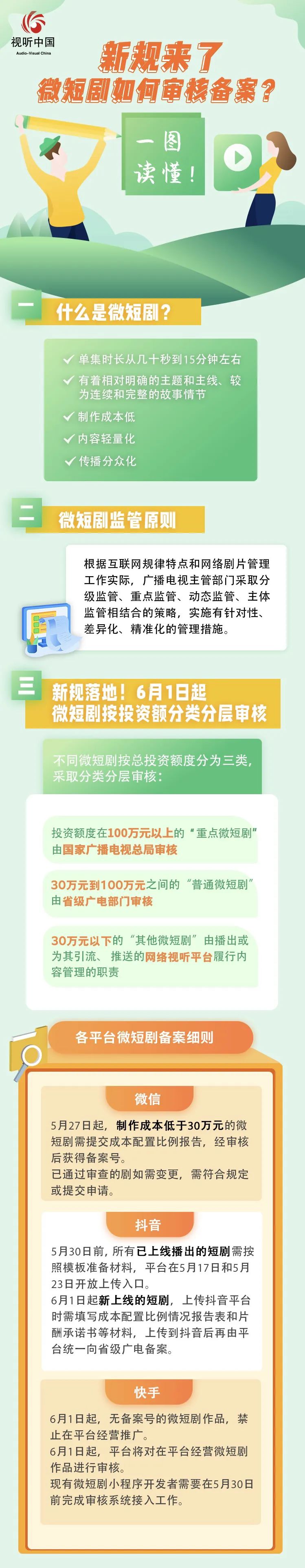 2024年6月1日起,微短剧开始实施新的备案流程,快手、抖音、微信等平台此前已陆续公布备案细则。微短剧如何备案、如何审核?监管原则是什么?一图带你看懂!