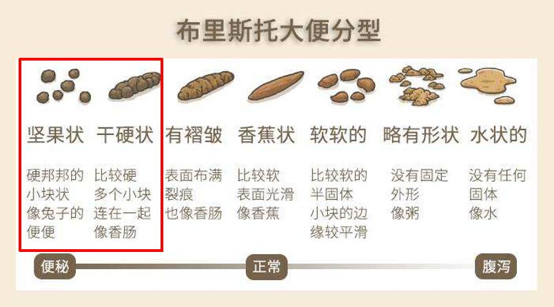 超过25%的排便为块状便或硬便(布里斯托大便分类第1-2型,见下图)。