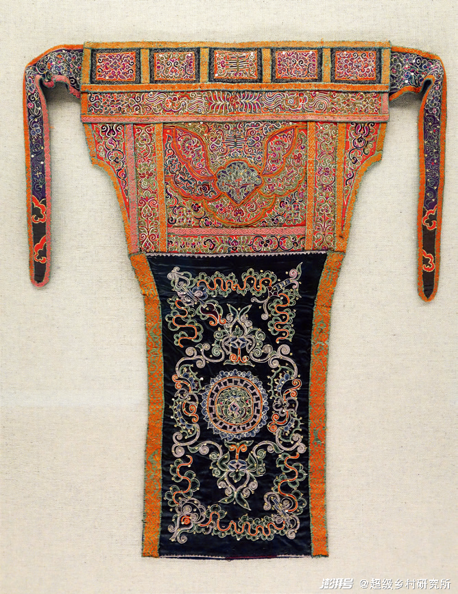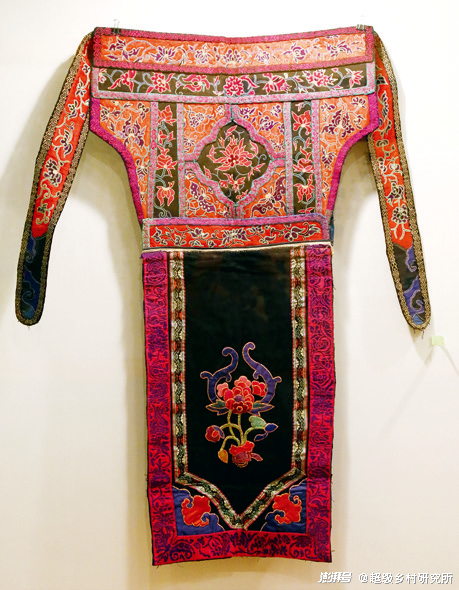 图中的这件服饰是水族妇女的传统服饰—裙饰围腰。围腰分上下两部分,整体为“T”形,围腰的上部是胸牌,呈梯形,有两条长带;下部呈长方形。