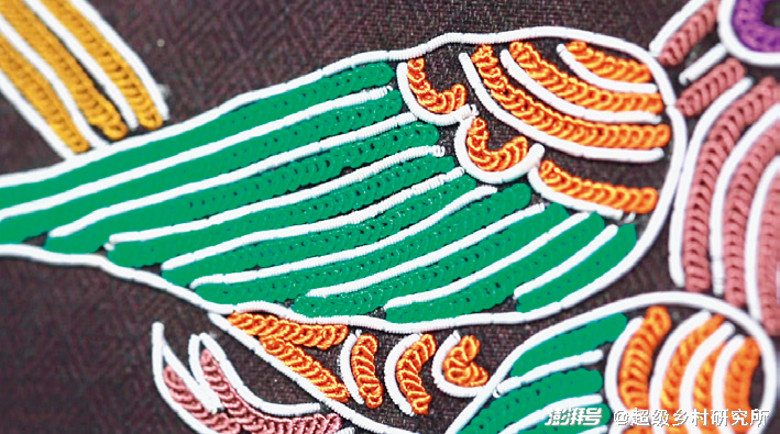马尾绣精美绝伦、华丽大方、具有浮雕质感,远远望去宛若一幅彩色浮雕。